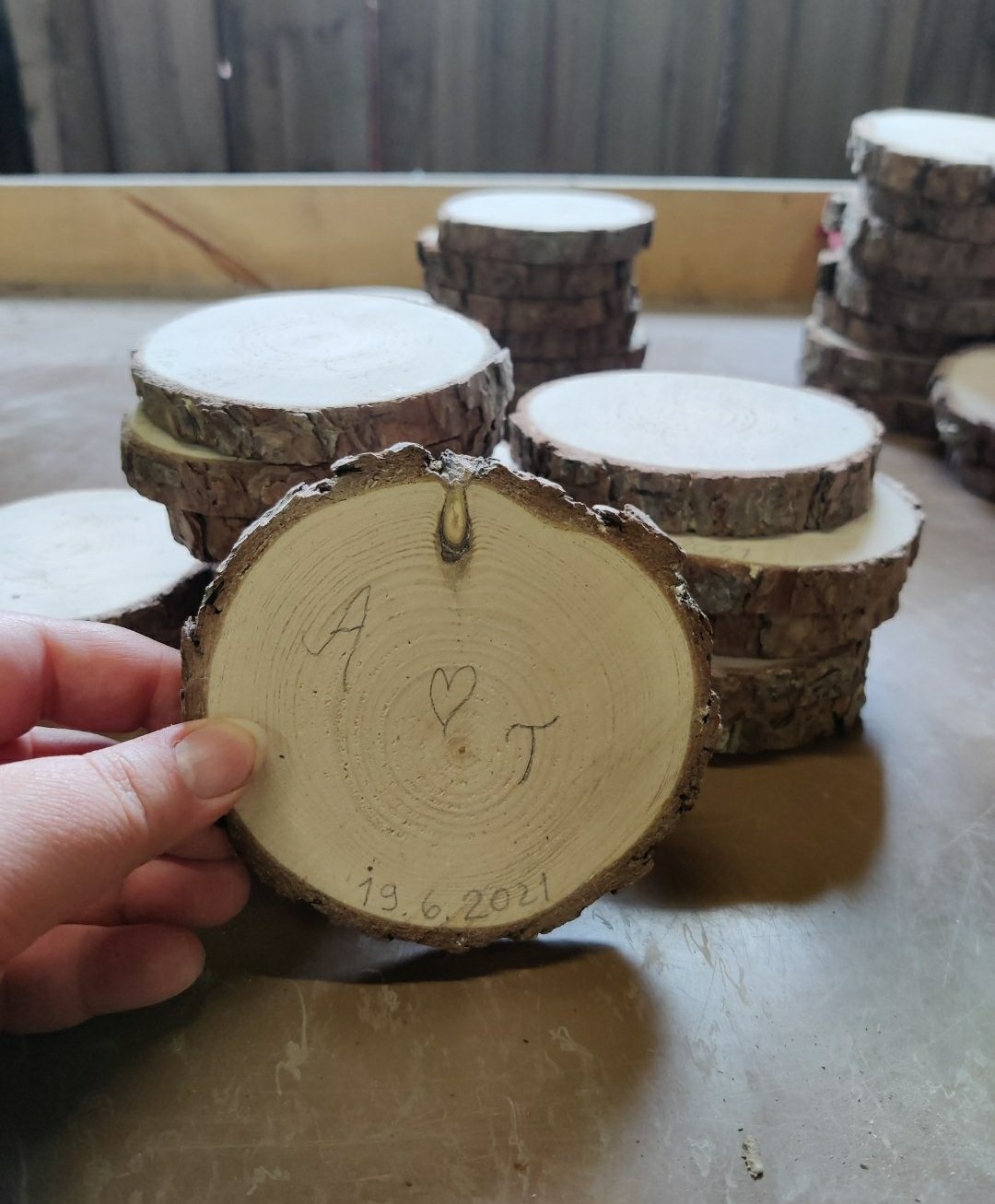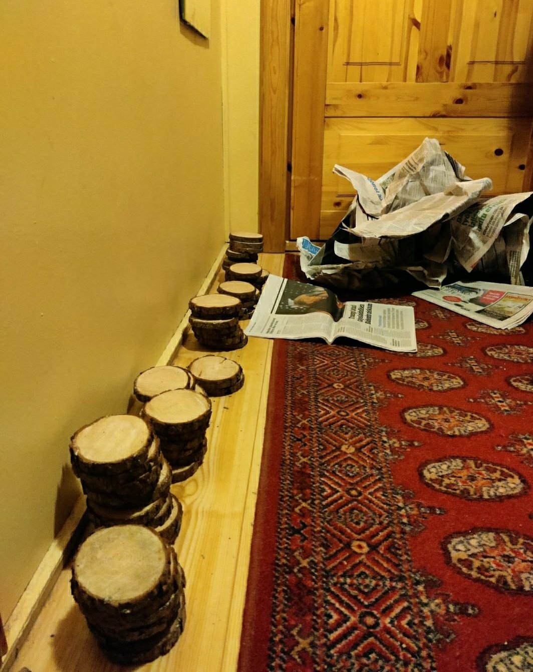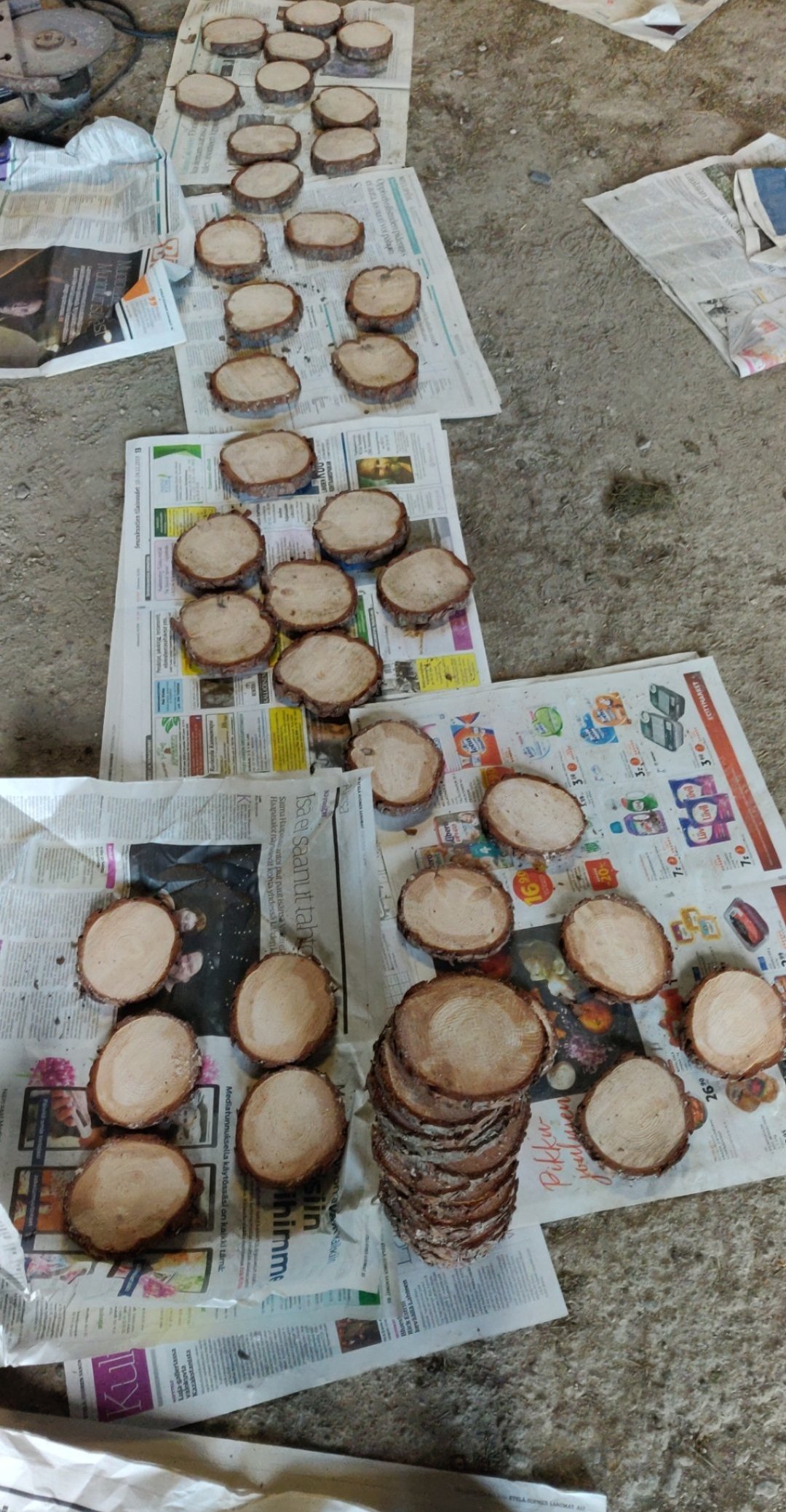 Seuraavaksi oli tarkoitus kuivattaa käsin sahatut kiekot. Tässä kohtaa pohdittiin paljon, miten se olisi järkevintä tehdä. Ihan aluksi kokeilin pätkästä yhden männyn muutamaan isompaan osaan ja kuivattaa niitä isompina pätkinä. Kokeeksi olin sahannut valmiitakin kiekkoja. Lopulta totesin isojen ”pöllien” vain halkeilevan päästä syvemmälle, kun taas valmiit kiekot pysyivät ehjinä. Olikin siis parempi kuivattaa ne pieninä, eli valmiina lasinalusina. Tässäkin paras tapa selvisi kokeilemalla. Kuivatuksen tein niin, että käärin lasinaluset hyvin sanomalehteen ja jätin ne ulkorakennukseen kuivumaan. Sanomalehtiä vaihdettiin aina välillä kuiviin. Tuolla sanomalehteen käärimisellä yritin ehkäistä lasinalusten liian äkillisen kuivumisen, joka johtaa taas halkeamiin (tästä oli löytynyt vinkkiä joltain netin keskustelupalstalta yleisesti puun kuivatukseen liittyen). Sanomalehdet imi kosteuden kyllä tosi hyvin! Aina vähitellen siirsin lasinalusia myös lämpimämpään paikkaan, pitäen niitä yhä sanomalehden välissä. On ihme, että maltoin niinkin hyvin antaa niiden kuivua rauhassa ennen työstöä! 😅 Ulkorakennuksesta siirsin ne muutaman viikon jälkeen kylmään eteiseen, josta taas jonkin ajan kuluttua siirsin ne lämpimään eteiseen. Yhä sanomalehtien sisällä. Viimeisenä ne olivat vielä joitakin viikkoja tuvassa, ensin sanomalehden välissä ja sitten lopuksi vielä ilman. Tämä osoittautui erittäin toimivaksi tavaksi, sillä noista 80-90 kiekosta vain muutamaan ilmestyi pieni halkeama. Kaksi yksilöä hylkäsin tyystin, sillä ne halkesi kunnolla. Pelkäsin ison osan halkeavan ja epäonnistuvan, ja siksi tein niitä niin paljon. On kuitenkin kiva, että niitä jäi nyt meille itsellekin monta muistoksi. Lisäksi annoimme niitä vielä muutaman eteenpäin osana bestmanien ja kaasojen kiitoslahjoja. En tiedä, kuinka kauan kuivuminen oikeasti olisi vaatinut aikaa ja millaiset olosuhteet olisivat olleet riittävät, mutta näin pelasin ainakin varman päälle. Tämä ei ole siis mikään varma ohje, vaan kokemukseni, miten kuivatus ainakin onnistui ilman suurempaa hävikkiä. Aikataulullisestihan oltiin ajoissa liikenteessä, joten hoppua ei ollut.