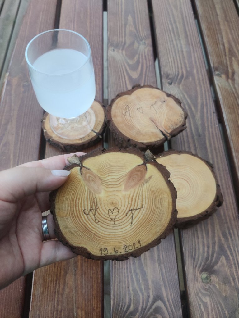 Olen aiemminkin kertonut, kuinka rakastan puutöitä – rakastin jo lapsena puukässää. Elämä ja opiskelut ovat vieneet paljon aikaa, ja tuosta puuhommasta on tullut etäännyttyä ja se on jäänyt, vaikka se into tuolla jossain takaraivossa onkin yhä kytenyt. Niinpä riemastuin, kun törmäsin netissä ajatukseen itsetehdyistä lasinalusista – ajattelin heti, että nuohan ovat loistava koriste ja vieraslahja häihin! Ja ennen kaikkea, niin meidän näköinen juttu. Siispä lähdin viime vuonna heinäkuun alussa mittanauhan kanssa etsimään metsästäni sopivankokoisia mäntyjä. Niitähän löytyi, ja siitä se ajatus sitten lähti!