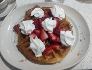 Yksi New Yorkin ”pakko maistaa” -ruuista (joita hieman etukäteen katsoimme netistä) on bagel. Erityisesti lohituorejuustotäytteellä. Otettiin leiviksi sellaiset valkosipulibagelit, ja tykkäsin kovasti. Meni ehkä parhaisiin aamupaloihin. Ensimmäisenä aamuna käytiin tietenkin amerikkalaiseen tapaan dinerissa eli kuppilassa, jossa leffatyyliin tultiin aina kaatamaan lisää kahvia pöytään. Minä tilasin omeletin, mutta se sisälsikin yllättäen lisäksi sekä paahtoleivät (2 kpl) että paistetut perunat. Naurettiin, että Topi otti combon, johon yhdisteltiin eri aamupaloja, mutta silti mä sain enemmän ruokaa. Menin vielä tilaamaan jälkkäriksi muffinsin, vielä ekana aamuna ymmärtämättä, että jenkeissä kaikki on suurta. Pelkkä muffinssi on siis joillekin aamupala. No, tämä oli meille sitten samalla lounas. Maksupolitiikkahan oli meille ihan outoa, ja yritettiin vakoilla, miten muut asiakkaat toimii. Lopulta kysyttiin, että maksetaanko tippi ovella vai jätetäänkö pöytään. Tyylinä oli siis jättää tippi erikseen pöytään ja maksaa lasku ovella lähtiessä. Ensimmäisenä aamuna dineriin tuli myös koditon anelemaan ruokaa, ja hänet häädettiin pian paikalta.
