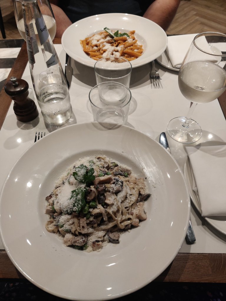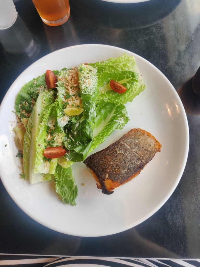 Pastaruuat oli tosi maukkaita, tykättiin niistä kovasti. Yritin myös kerran saada salaatin, koska tuntui, että en kestä enää näitä ruokia. Olisi varmaan pitänyt mennä erikseen salaattibaariin. Otin kalaravintolassa lohisalaatin, ja se ei ollut ehkä ihan sitä mitä odotin. Nälkähän siitä jäi, ja hintaa oli kuitenkin lähes 30 dollaria. Alla kuva salaatista, joka sisälsi pari hassua salaatinlehtä, pari kirsikkatomaattia sekä kuivattua valkosipulia ja parmesaania. Ihan hyvää se kyllä oli.