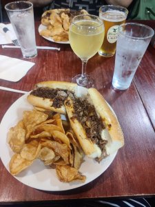 Philadelphiassa oma erikoisuus on Philly Cheesesteak, joka on käytännössä lihaa leivän sisällä (yllätys). Mausteeksi lihaan voi ottaa esimerkiksi sipulia ja sieniä. Tokihan kokeilimme tätä, ja sehän maistui yllättävän hyvältä! Hieman jännältä tuntui nuo sipsit tuossa kyljessä, eikä ne ollu mitenkään erityisemmin mun makuun. Kyseisessä paikassa sai myös ananassiideriä, joka sai kyllä 5/5 pisteet minulta. Tarjoilija oli superystävällinen ja hauska, joka yritti hahmottaa, mitä kieltä puhutaan (luuli tosin saksaksi, joten pieleen meni). Hän oli reissullamme ainoa tarjoilija, joka jutusteli muutakin kuin ruuasta.
