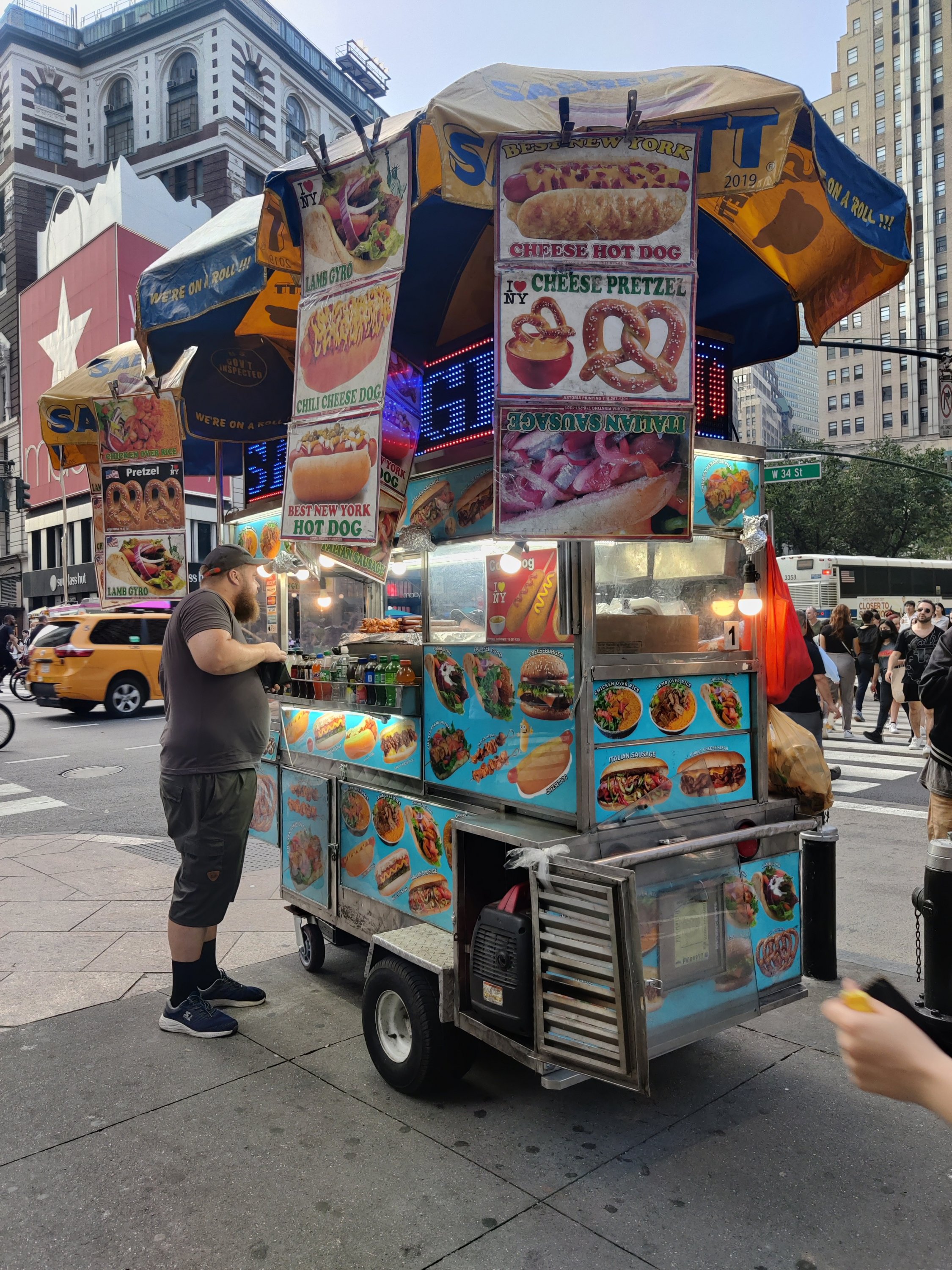 Jos joku sanoo New York, yksi ensimmäisistä mieleen tulevista asioista katukuvassa on kyllä ollut nuo hot dog -kojut. Niin tyypillistä New Yorkia, että pakkohan sitä oli testata! Ei etsitty mitään parasta kojua, vaan otettiin mikä sattui eteen tulemaan. Eihän tuo nyt kovin erikoinen ollut, mutta toihan se aitoa NYC-fiilistä. Kojuja oli erilaisia, osa tarjosi myös vähän spesiaalimpia versioitakin.
