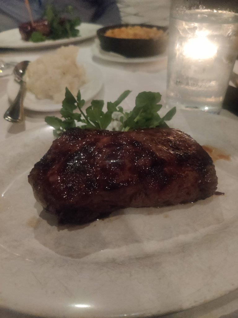 Käytiin myös yhden kerran hieman paremmassa pihviravintolassa – joskin jätettiin kuitenkin sellaiset tosi kalliit vaihtoehdot pois, joihin oli tietyt vaatetusvaatimukset. Mulle ei nuo jenkkiläiset mittayksiköt oikein sano mitään, joten oli hauskaa elää vähän ”reunalla”. Pohdin Topille menua lukiessani, että onkohan tämä sellainen fiini paikka, että joutuu menemään hot dog -kojun kautta kotiin? Pihvin kooksi oli merkitty ”12 oz”. Muutakaan kokoa ei ollut, eikä ravintolassa ollut wifiä, jotta olisi voinut googlettaa – joten tuolla mentiin. Jälkeenpäin kun googletin, oli pihvin koko reilut 320 g. Sanotaanko näin, että kyllä se oli ihan riittävä. Pihvi oli New York Strip Steak, joka saadaan naudan selästä. Pihvi oli mielettömän rapea pinnasta, pehmeä mutta ei kuitenkaan liikaa. Todella hyvä, jokaikinen suupala oli nautinto!
